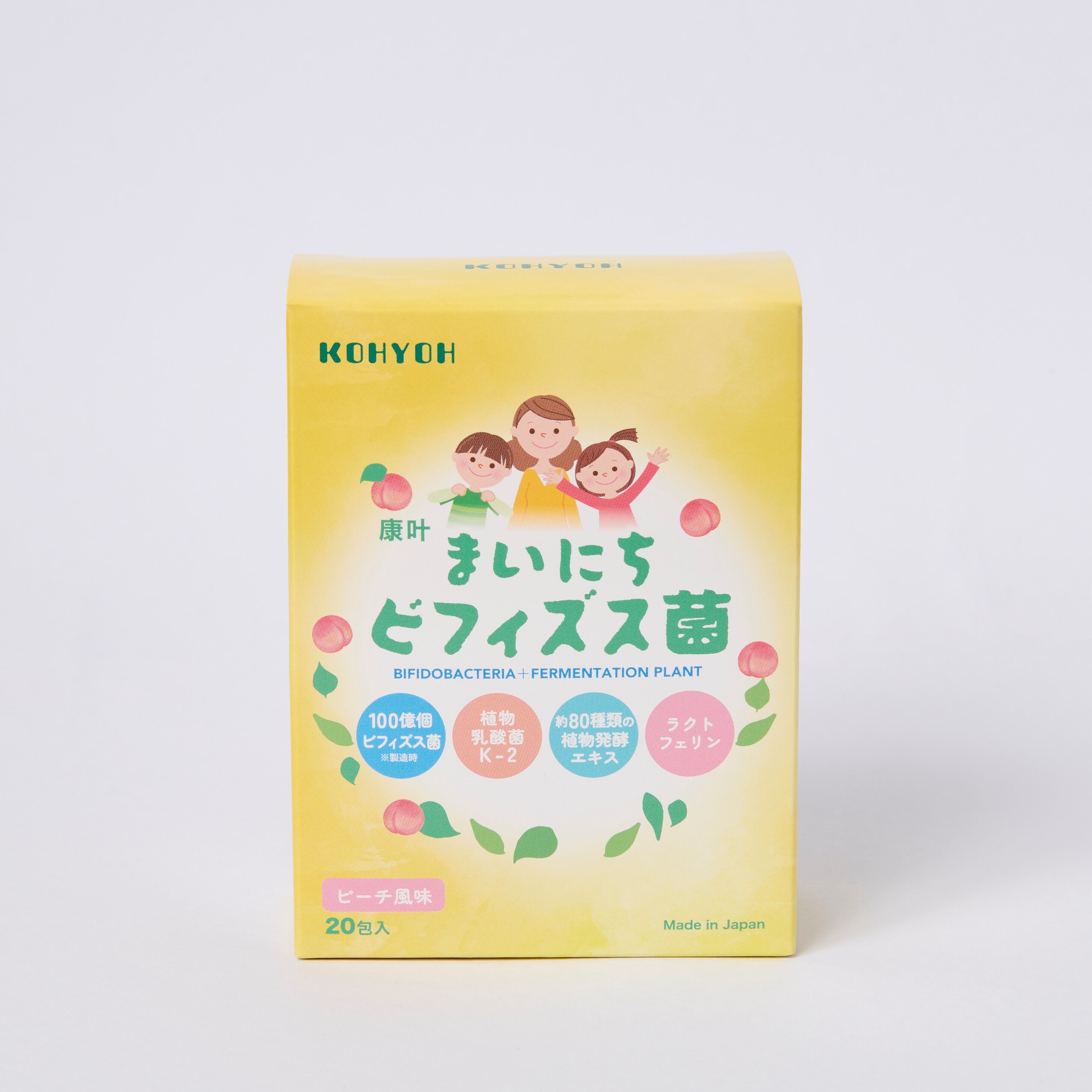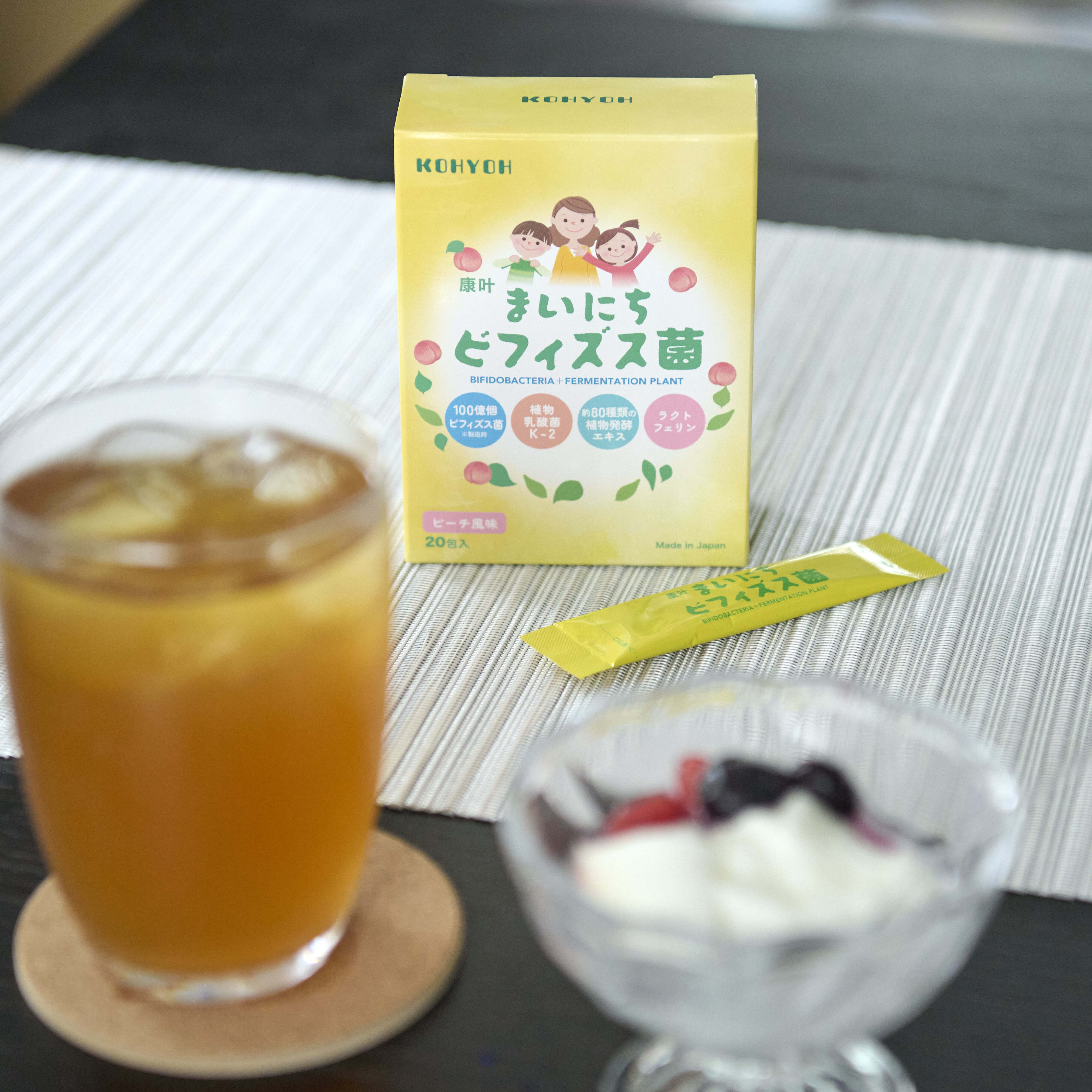 ■原材料名:還元麦芽糖水飴、ビフィズス菌乾原末、ピーチ果汁末、植物発酵乾燥粉末(デキストリン、植物発酵乾燥粉末)、植物性乳酸菌(殺菌)、イソマルトオリゴ糖/トレハロース、デキストリン、リン酸三カルシウム、クエン酸、香料、ラクトフェリン、(一部に乳成分・桃・オレンジ・キウイフルーツ・バナナ・リンゴ・大豆を含む)