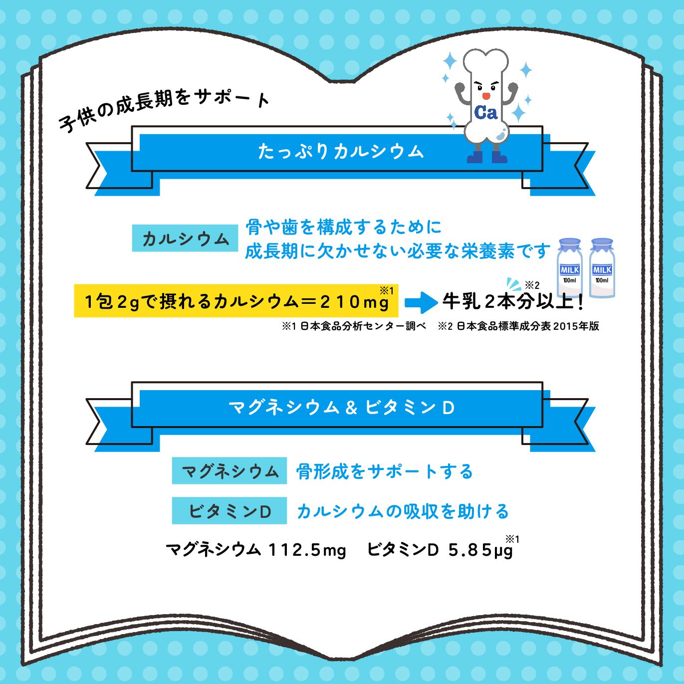 栄養補助食品として1日1~2包を目安(お子さまは1包)に、水、牛乳、ヨーグルトなどに混ぜてお召し上がりください。