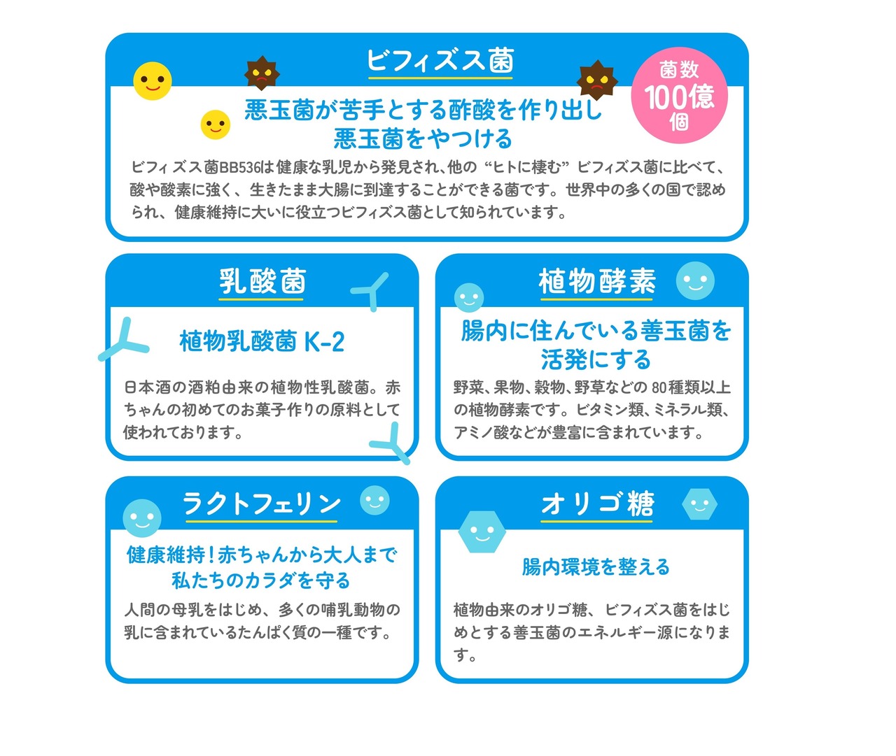 代表的な善玉菌である森永乳業のビフィズス菌BB536+植物性乳酸菌K-2+植物発酵エキス+ラクトフェリンを配合