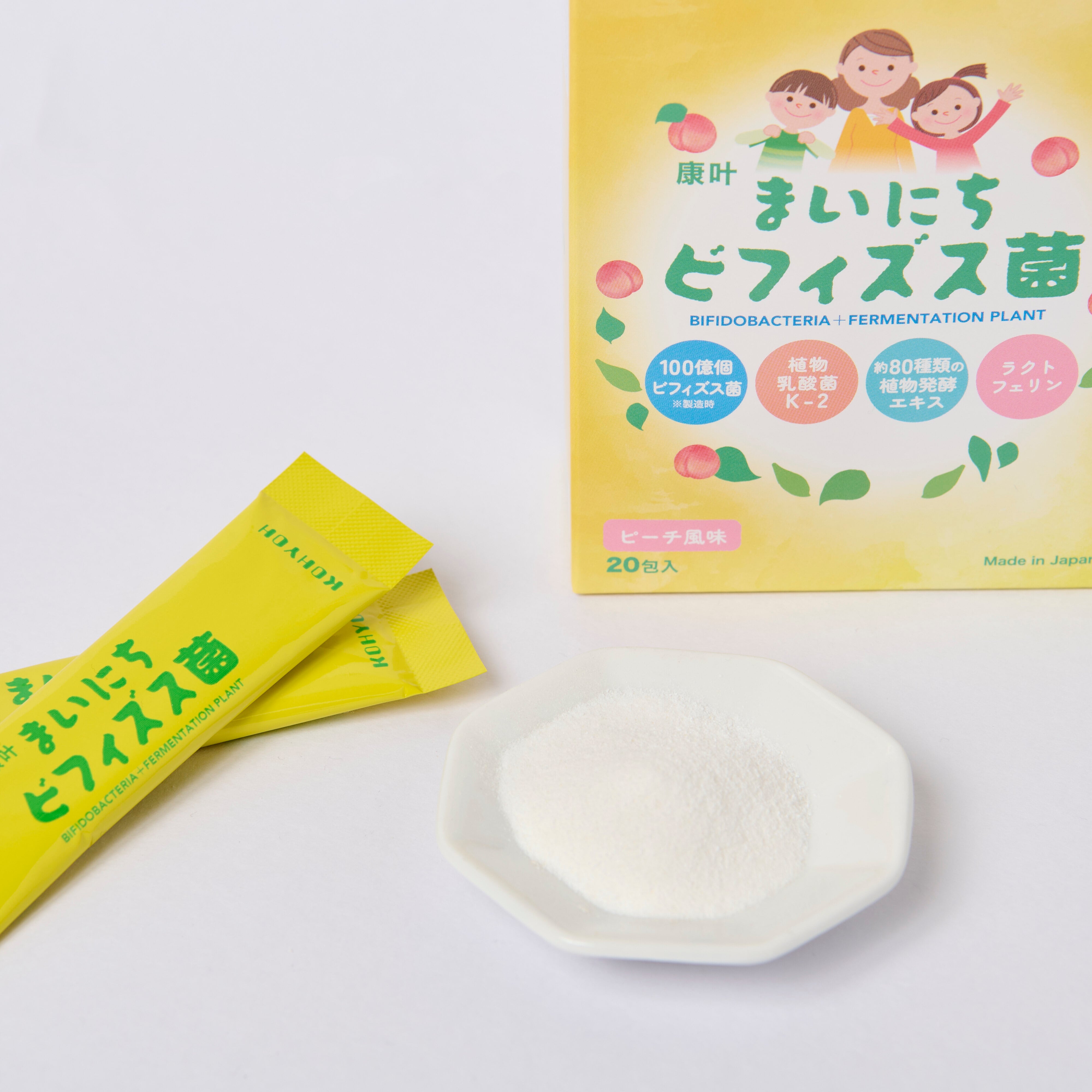 ■原材料名:還元麦芽糖水飴、ビフィズス菌乾原末、ピーチ果汁末、植物発酵乾燥粉末(デキストリン、植物発酵乾燥粉末)、植物性乳酸菌(殺菌)、イソマルトオリゴ糖/トレハロース、デキストリン、リン酸三カルシウム、クエン酸、香料、ラクトフェリン、(一部に乳成分・桃・オレンジ・キウイフルーツ・バナナ・リンゴ・大豆を含む)