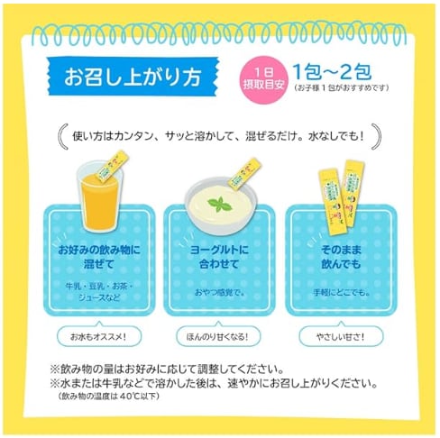 栄養補助食品として1日1~2包を目安(お子さまは1包)に、水、牛乳、ヨーグルトなどに混ぜてお召し上がりください。
